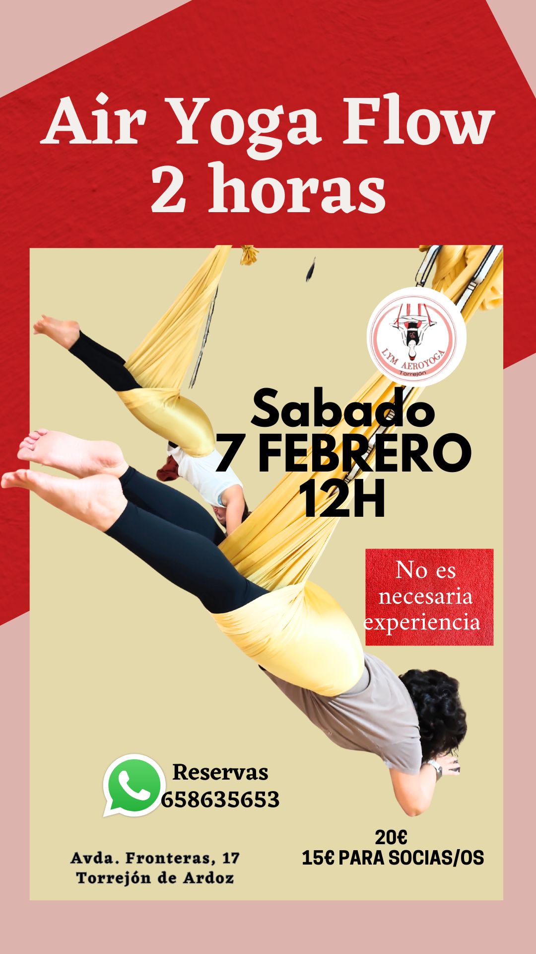 Una clase especial de Air Yoga Flow. No se necesita experiencia previa. La duración es de 2 horas. El precio es de 20€ por sesión, 15€ para socios.
