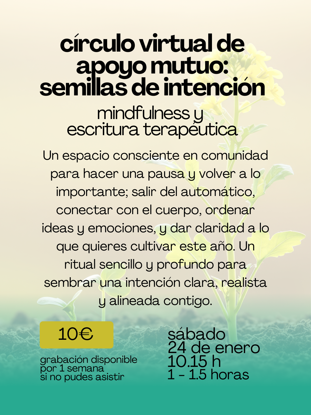 En esta sesión trabajaremos una meditación para soltar y confiar, un ejercicio de respiración, y cerraremos con un pequeño ejercicio de escritura terapéutica.