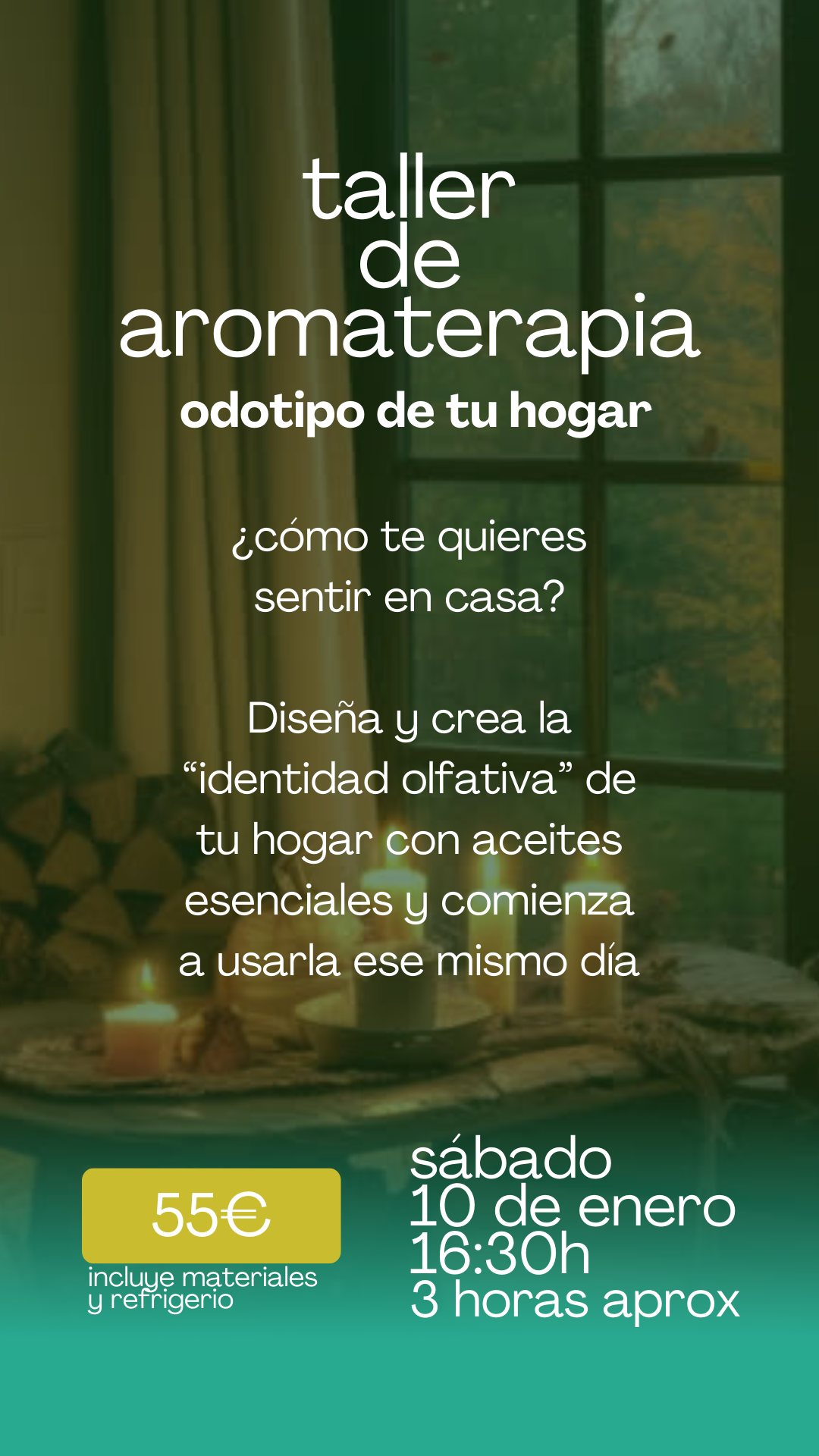 El sábado 10 de enero, te invitamos a vivir una experiencia única. Durante 3 horas exploraremos el mundo de los odotipos, una forma de entender cómo los aceites esenciales reflejan tu personalidad, tu energía y tu momento vital. En este encuentro aprenderás a: 🌿 Comprender qué es un odotipo y cómo puede ayudarte en tu día a día. 🌿 Diseñar y preparar tu propia mezcla personalizada de aceites esenciales, creada por ti y para tu hogar. Te llevas a tu casa la mezcla para usarla desde ese día. Será un espacio amoroso y creativo, pensado para que conectes contigo mismo/a, con la naturaleza de los aceites esenciales y con la belleza de tener un odotipo que hable de ti, y de esas emociones que quieres que tu hogar evoque para ti y los tuyos (además todo lo que preparemos vendrá con instrucciones pet-friendly, por si tienes familia peluda) 🌸 Plazas limitadas – Reserva ya la tuya y regálate una mañana de bienestar, conexión y creación. 💫Inversión: 55 € que incluyen: 3 horas de acompañamiento en aprendizaje y práctica. Materiales Libro de apoyo con todo el proceso Refrigerio