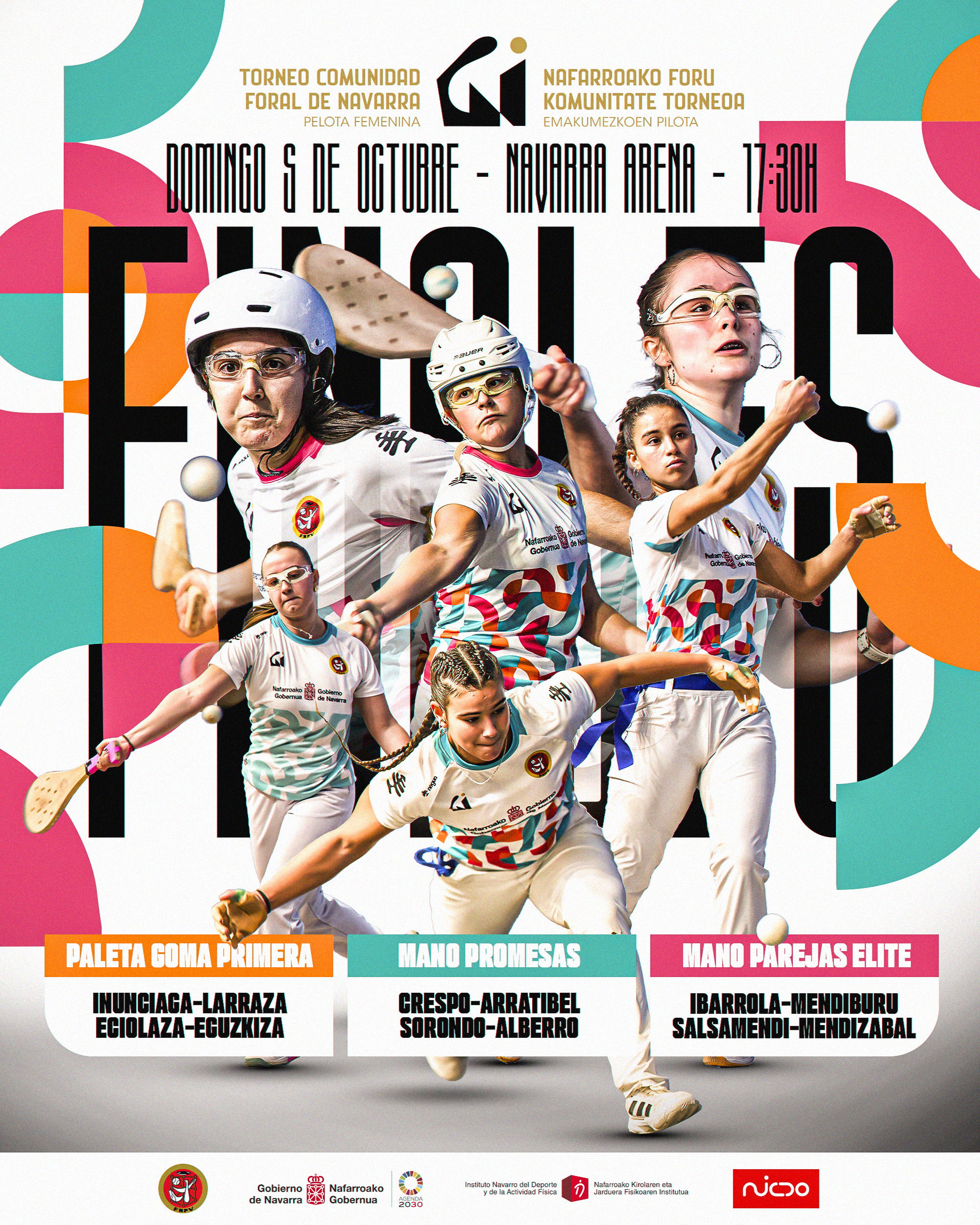 Este domingo 5 de octubre a las 17:30 h se celebrarán en el Navarra Arena las finales del Torneo Comunidad Foral de Navarra de pelota femenina, un evento que busca dar visibilidad al deporte femenino y apoyar a las pelotaris. La entrada es gratuita con invitación, que puede descargarse en este enlace o recogerse en la taquilla el mismo día. El aforo será de 2.000 personas. Los partidos programados son: Inunciaga–Larraza contra Eciolaza–Eguzkiza en paleta goma 1ª, Crespo–Arratibel contra Sorondo–Alberro en mano promesas, e Ibarrola–Mendiburu contra Salsamendi–Mendizabal en mano élite.