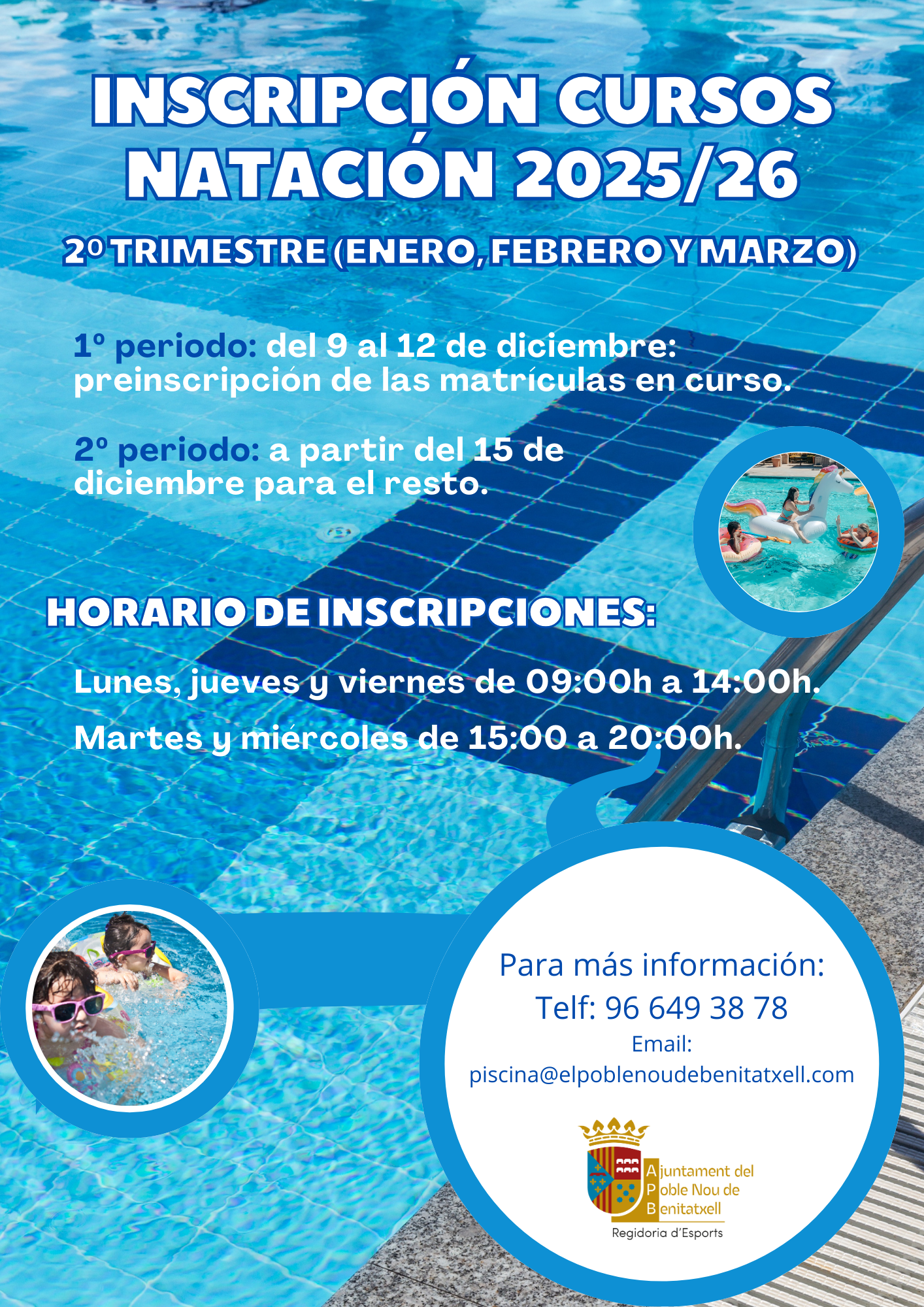 La Piscina Municipal El Poble Nou de Benitatxell obri, del 15 al 26 de setembre, el període d'inscripció als cursos de natació i aquagym per al primer trimestre. Es poden consultar els horaris de matriculació al cartell.