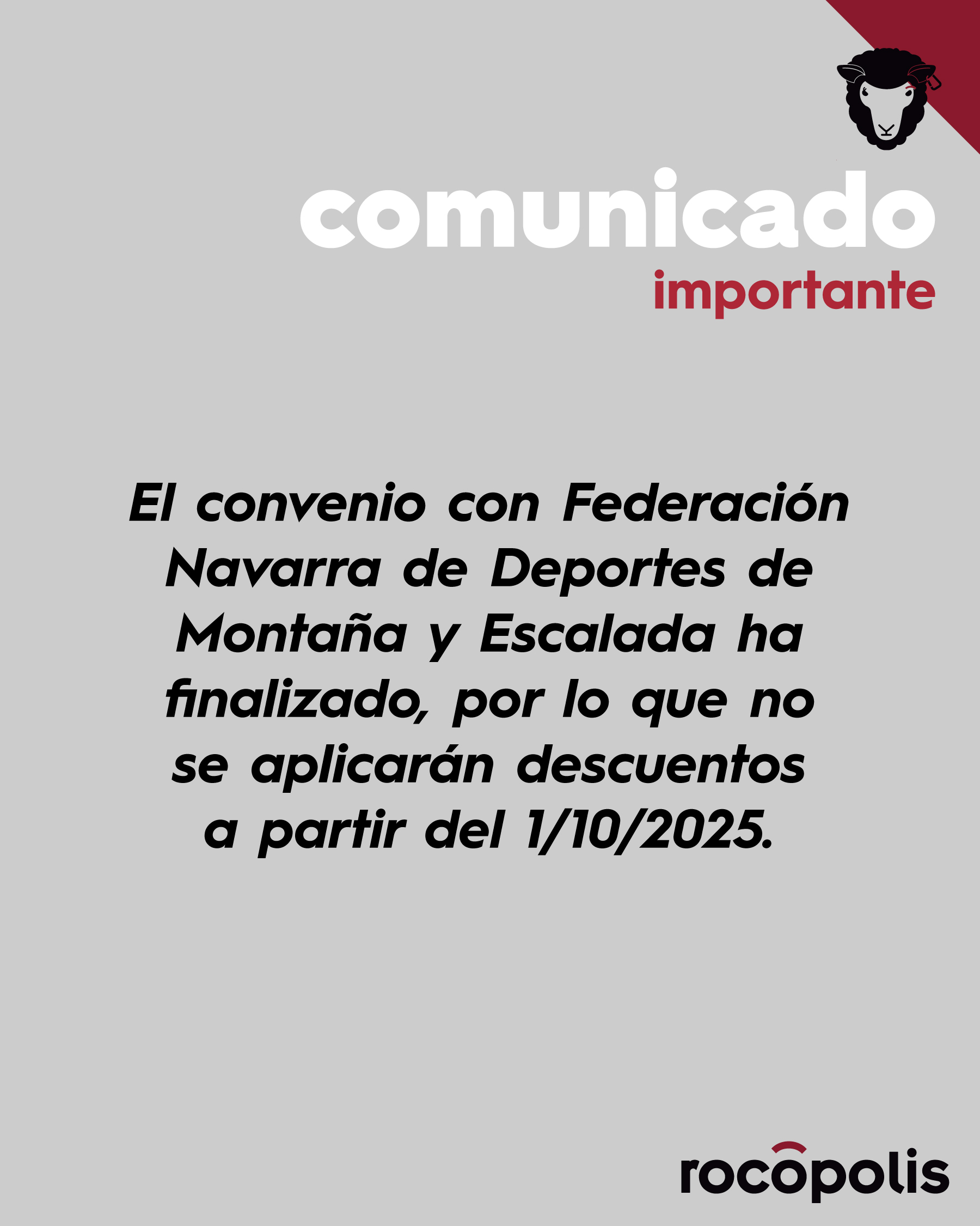 Queremos informarte de que, a partir del 1 de octubre, ya no se aplicará el descuento para personas federadas en deportes de montaña y escalada en Rocópolis.